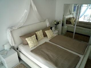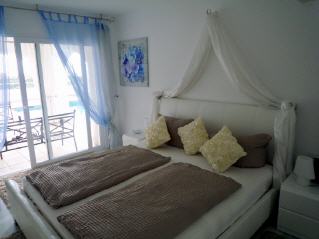 This bedroom (bed measures 180x200cm) is situated on the ground floor (on the same floor as the living quarters). The bedroom is “en suite” connected with a bathroom (fitted with double washbasin, WC, bidet and bathtub). The room has an individual air conditioning and marble heater. Through a big sliding window you have access to the pool-terrace.
